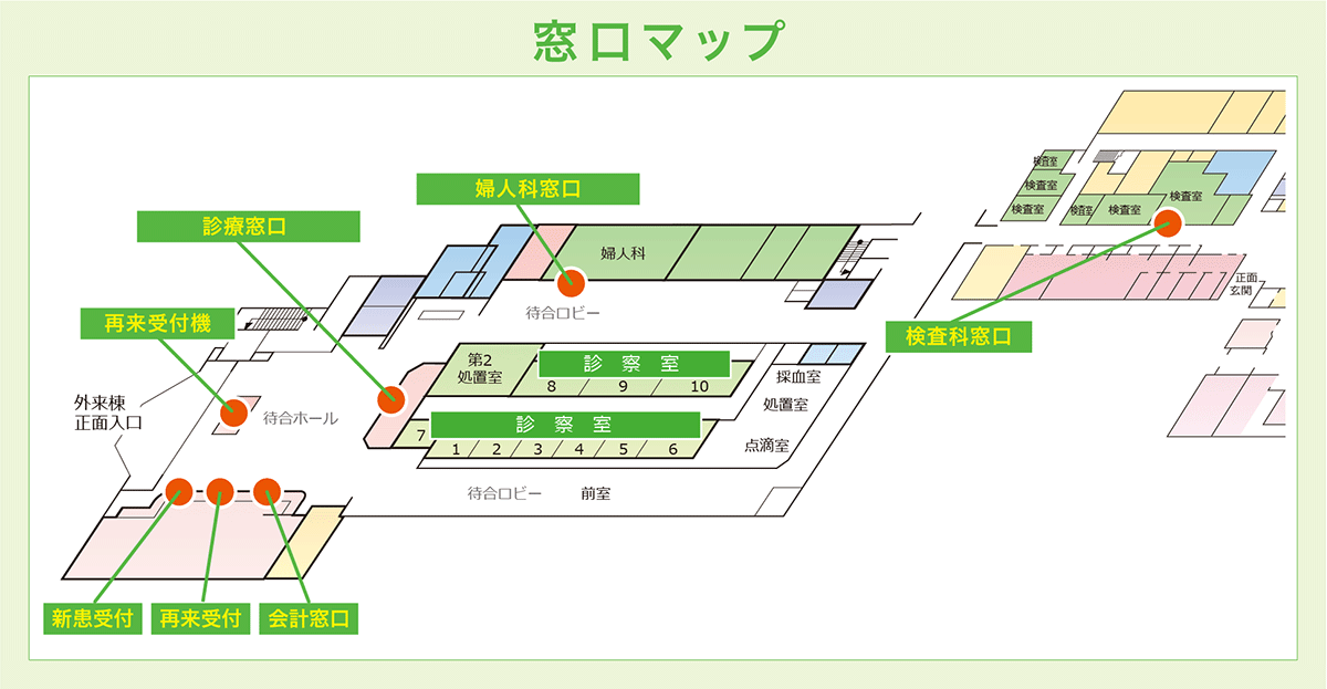 - 「受付票(クリアケース)」をお持ちになり、各診療科窓口へ -